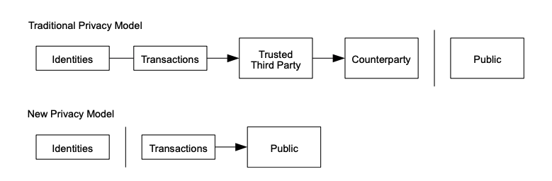 传统的银行模型通过限制信息访问到参与方和受信任的第三方来实现一定程度的隐私。需要公开宣布所有交易排除了这种方法,但仍然可以通过在另一个地方中断信息流来保持隐私:通过保持公钥匿名。公众可以看到有人向另一个人发送了一定金额,但没有信息将交易与任何人联系起来。这类似于证券交易所发布的信息水平,其中个别交易的时间和规模是公开的,但没有透露交易方是谁。