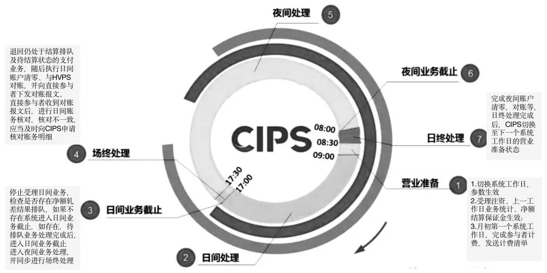 CIPS运行时间为5*24小时+4小时,在法定工作日全天候运行,分为日间场次和夜间场次,共有7个运行状态:营业准备、日间处理、日间业务截止、场终处理、夜间处理、夜间业务截止、日终处理。