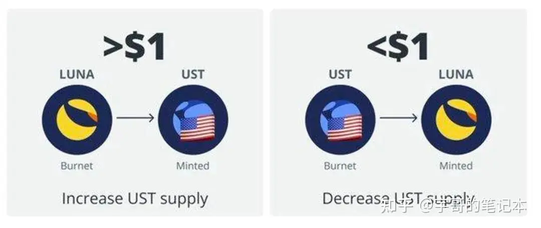 稳定币UST的目标价1美元;波动代币LUNA价值由生态共识支撑;它的套利机制是无论UST价格如何,你随时可以用价值1美元的LUNA铸造1个UST,反之亦然。