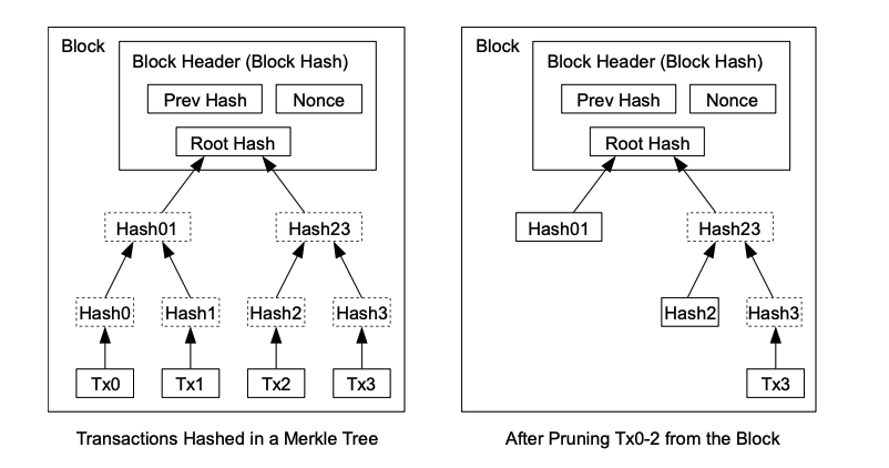 一旦一个币的最新交易被足够多的区块掩埋,这笔交易之前该币的花销交易记录被丢弃以节省磁盘空间。为了在不破坏区块哈希的情况下实现这一点,交易被哈希在一个默克尔树中 [2][5][7],只有根包含在区块的哈希中。旧区块可以通过截断树的分支来压缩。内部哈希不需要存储。