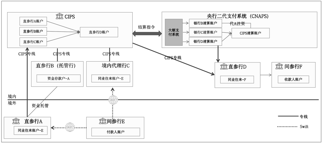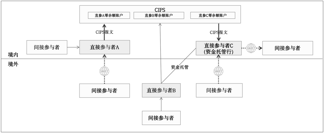 各直参行通过CIPS直接办理人民币跨境支付清算业务,各间参行通过直参行办理跨境支付清算业务
