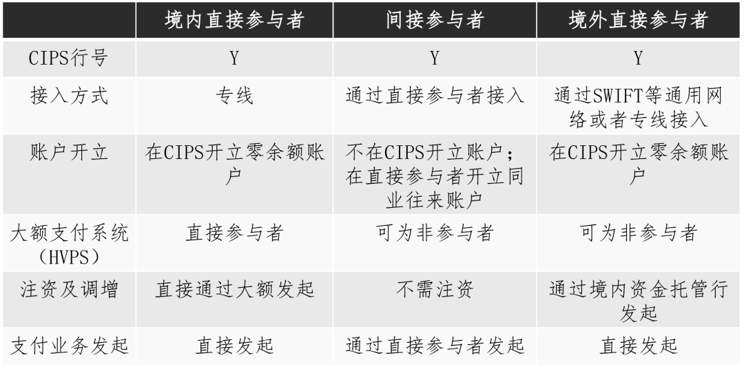 CIPS的参与者分为直接参与者和间接参与者,其中,直接参与者又可以分为境内支付直接参与者和境外直接参与者
