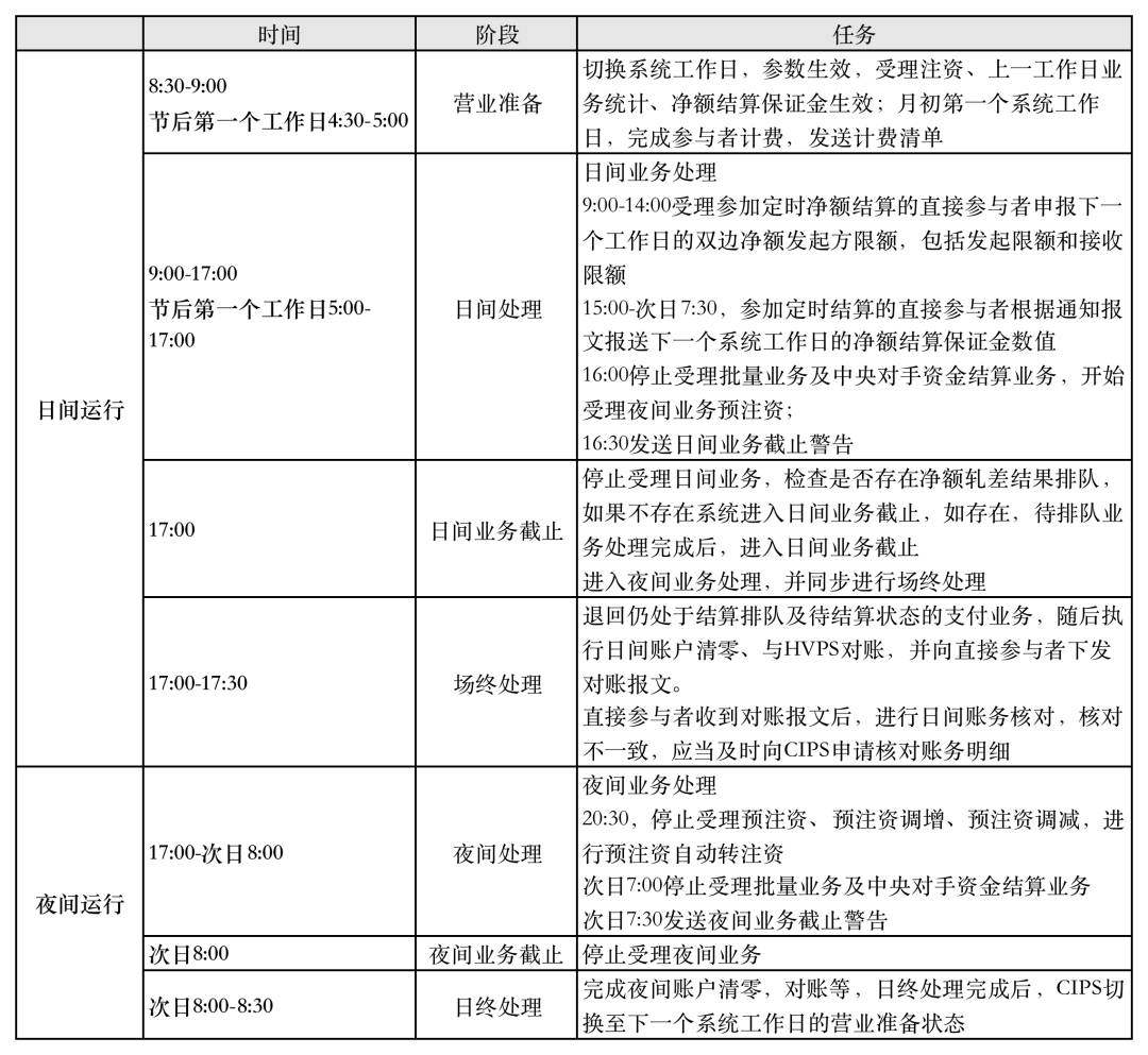 CIPS运行时间为5*24小时+4小时,在法定工作日全天候运行,分为日间场次和夜间场次,共有7个运行状态:营业准备、日间处理、日间业务截止、场终处理、夜间处理、夜间业务截止、日终处理。