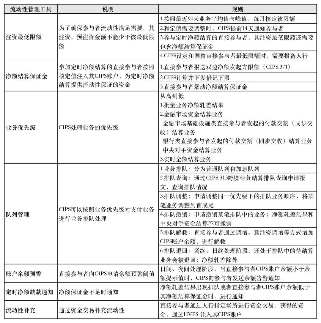 除了给参与者提供了管理流动性的工具,同样CIPS也有一系列的策略来规避流动性风险,比如净额结算保证金、排队、余额预警等手段。具体工具如下表所示