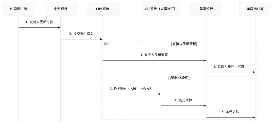 以国内企业向美国企业进口付款为例,看整个人民币跨境支付清算的流程,其中可以全链路人民币,也可以兑换为美元。