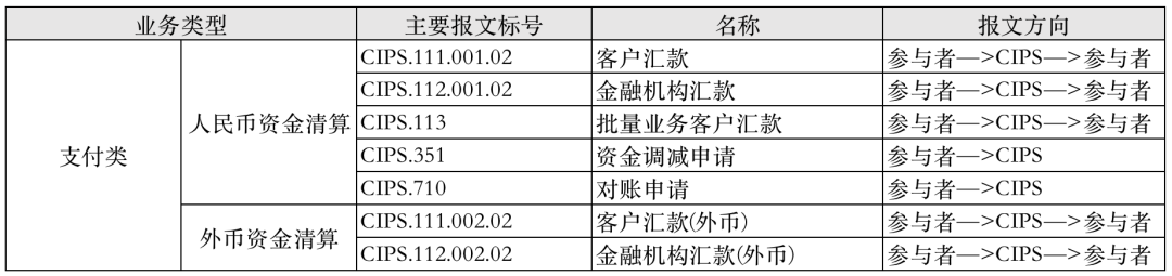 CIPS处理的业务包括支付类和信息类两大类。其中,支付业务包括客户汇款、金融机构汇款、批量业务和金融市场资金结算业务;信息业务包括查询业务等。以下是几个典型报文,后续仅以111客户汇款作为案例进行分析,其他的业务类型类似