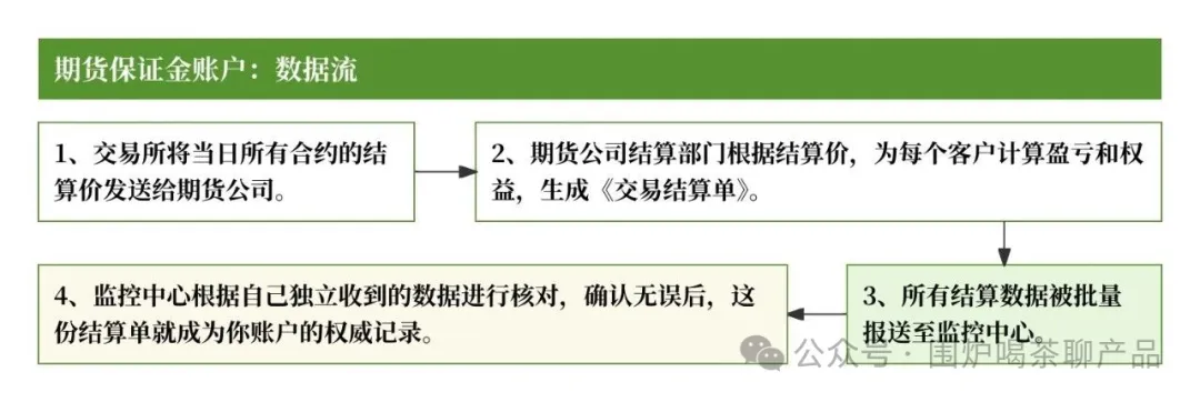 3、数据流:1、收盘后,交易所将所有投资者的盈亏汇总至交易所结算账户,再划付给期货公司结算账户;2、投资者持仓需缴纳的保证金,通过期货公司结算账户上存至交易所结算账户。